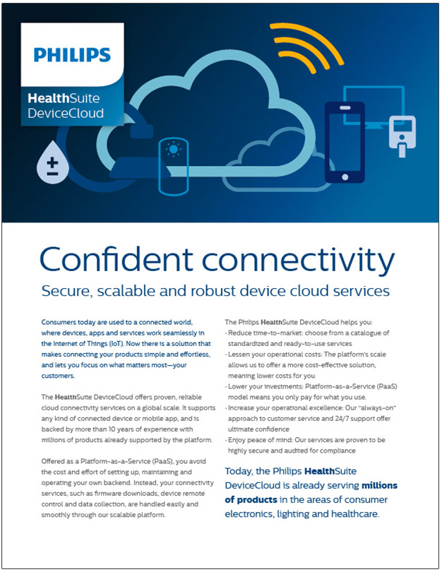 Consumers today are used to a connected world, where devices, apps and services work seamlessly across the Internet of Things. Now there is a solution that makes connecting your products simple and effortless, and lets you focus on what matters most—your customers. The HealthSuite device cloud offers proven, reliable device connectivity services on a global scale, including a dedicated instance in mainland China. It supports any kind of connected device or mobile app, and is backed by more than 10 years of experience with millions of products already supported by the platform. Offered as a Platform-as-a-Service (pay per use), as part of our HealthSuite Digital Platform, you avoid the cost and effort of setting up, maintaining and operating your own backend. Instead, your online service communications, such as firmware updates, user registration and data collection, are handled easily and smoothly through our scalable platform.